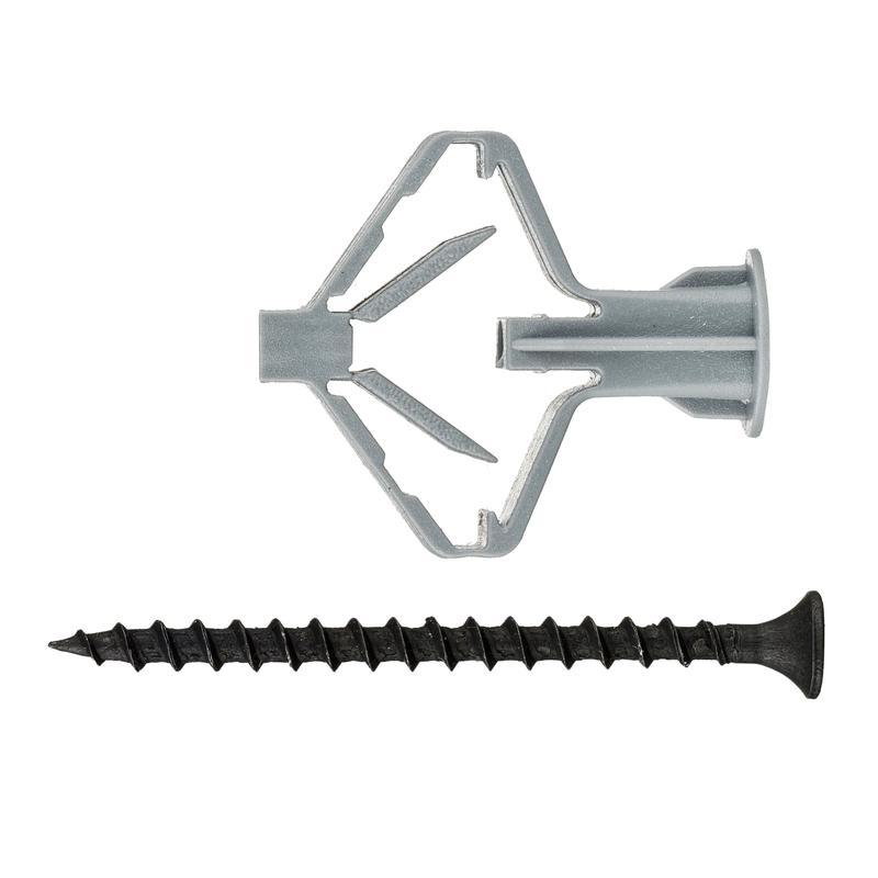 В состав комплекта входят: дюбели для гипсокартона TNF 10,0х50 мм и универсальные саморезы с потайной головкой 4,0х60 мм. Дюбель бабочка TNF применяется для крепления конструкций небольшого веса (деревянные направляющие, полки, карнизы и пр.) к гипсокартонным листам (ГКЛ). Изготовлен из полипропилена. Конструкция дюбеля обеспечивает надежную фиксацию в материале основания. Дюбель устанавливается в предварительно просверленное отверстие диаметром 10 мм. При затягивании шурупа лепестки дюбеля подтягиваются к задней поверхности основания и образуют упор.