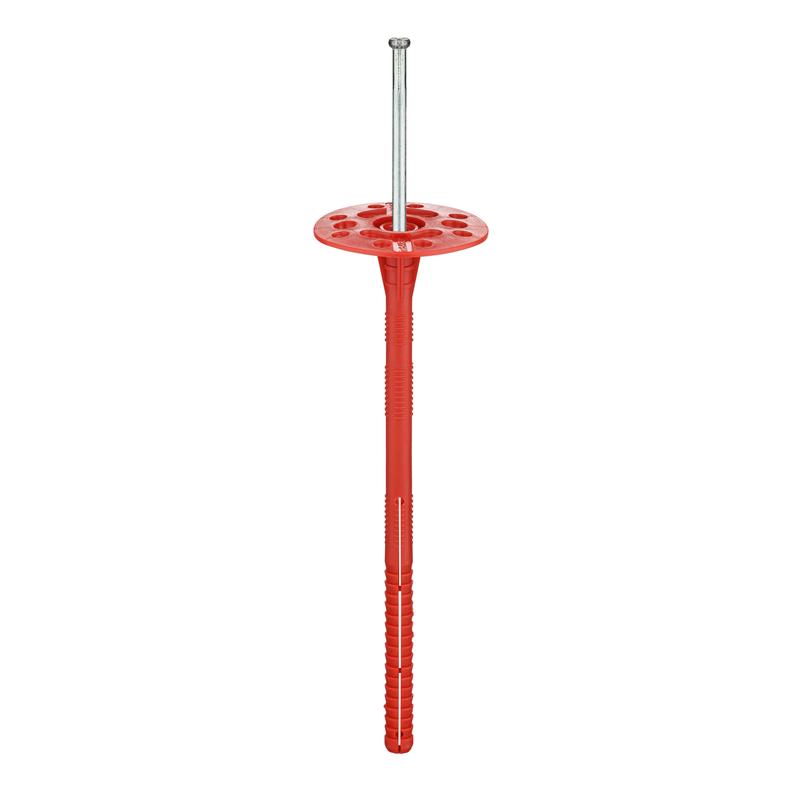 Тарельчатый дюбель IZM состоит из следующих элементов: дюбель с двухсегментной распорной зоной и увеличенной прижимной шайбой диаметром 60 мм, и распорный элемент – гвоздь. Дюбель выполнен из полипропилена, гвоздь – из углеродистой стали с антикоррозионным горячеоцинкованным покрытием. Дюбель предназначен для крепления теплоизоляционных строительных материалов и изделий (толщиной до 240 мм) к основаниям из бетона, кладки из полнотелого силикатного керамического и пустотелого керамического кирпича, ячеистого бетона. Установка производится методом сквозного монтажа. В среднем на 1 кв. м площади теплоизоляции применяется 5-6 дюбелей.