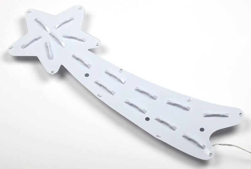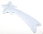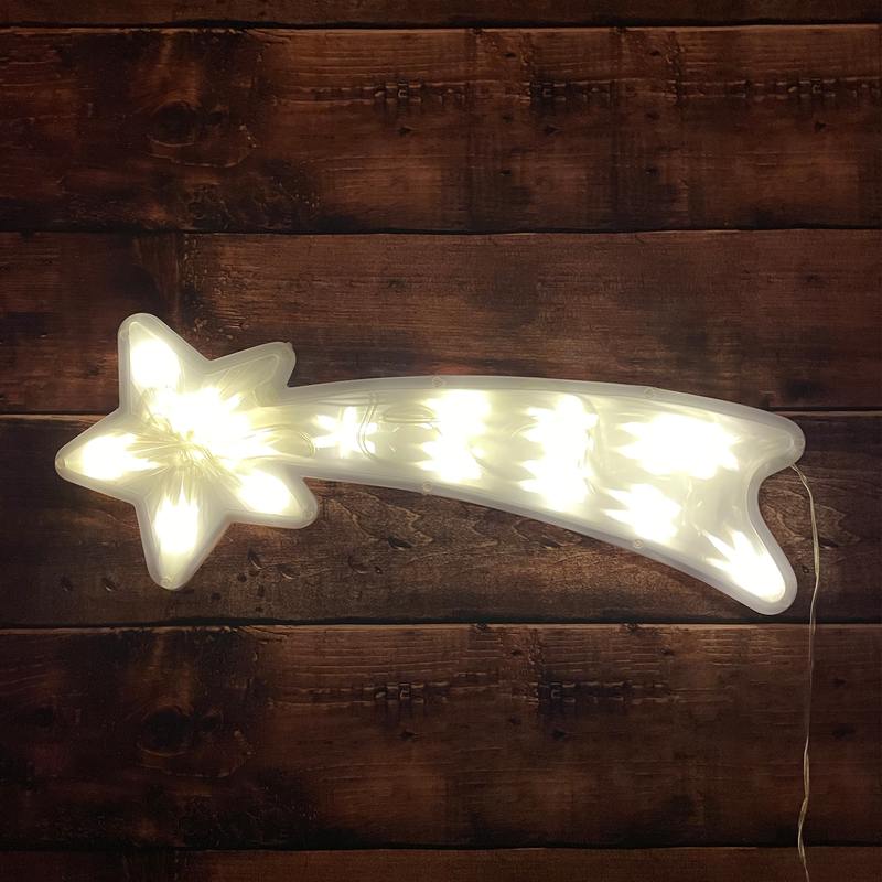Новогодняя настенная светодиодная фигура ЭРА "Комета" (арт. Б0041937) для праздничного декора внутри и снаружи помещений. Защищена от влаги и пыли (IP44), отличается морозостойкостью. Работает от стандартной электросети 220 В, прозрачный провод практически не заметен. Изготовлена из ударопрочного пластика. LED-фигура представляет собой комету, похожа на падающую звезду. можно вешать как нравится: звездой влево или звездой вправо. Светится тёплым белым светом, который создаёт атмосферу уюта. Дизайн фигуры идеально подходит к зимним праздникам. Размеры фигуры: 55 х 4,2 х 25 см. В качестве источников света применены 15 ярких и экономичных светодиодов, которые не перегреваются даже при длительной работе без перерывов. Новогодняя LED-фигура — простой и быстрый способ создать праздничное настроение, украсить дом, офис, общественное пространство.
