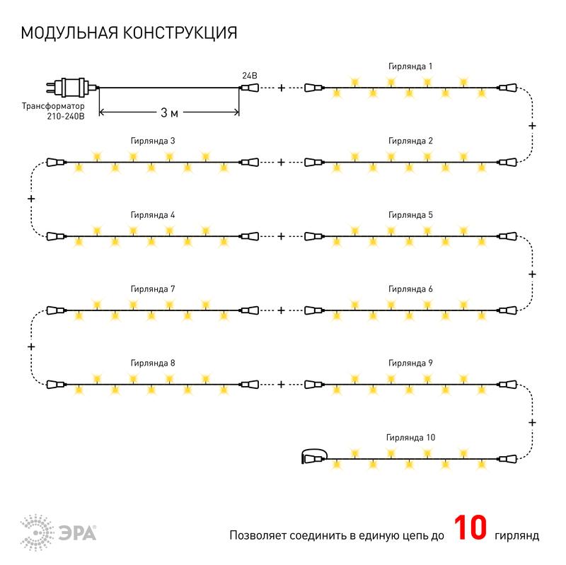 Характеристики ENON-5B ЭРА Гирлянда LED Нить 5 м теплый свет, 24V, IP44: