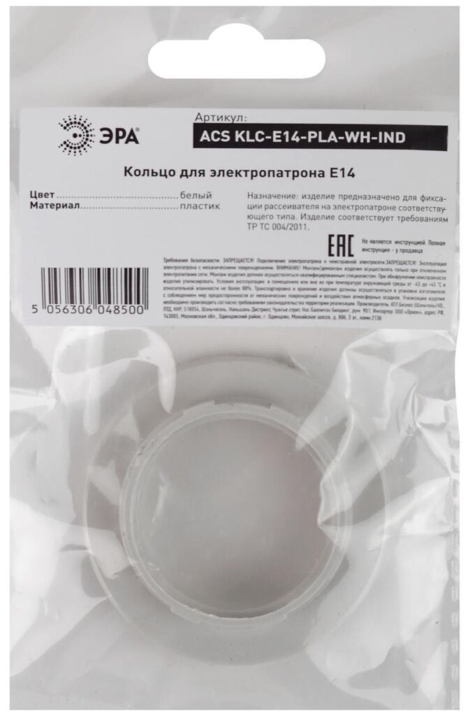 Характеристики ЭРА Кольцо для патрона E14, пластик, белое:
