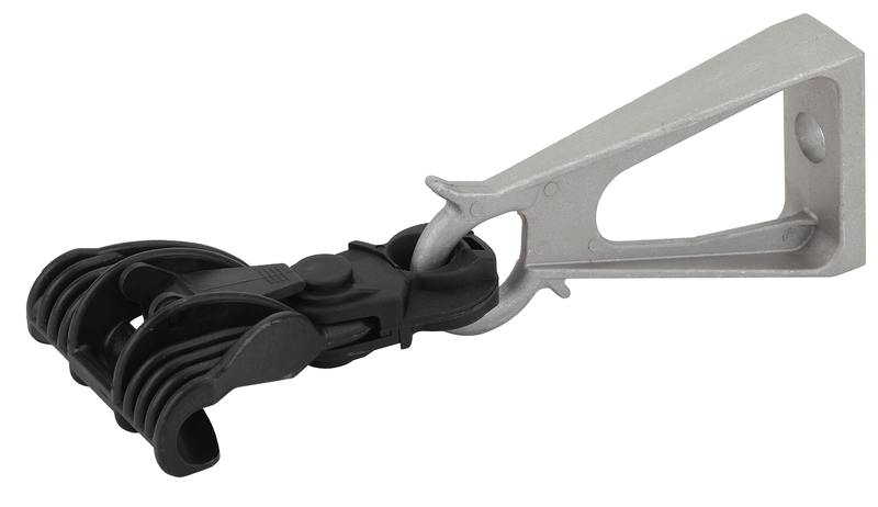 Промежуточный поддерживающий зажим представляет собой жесткую сборку несущего кронштейна и собственно подвеса. Используется для поддерживающего крепления изолированной несущей нейтрали на промежуточных опорах.