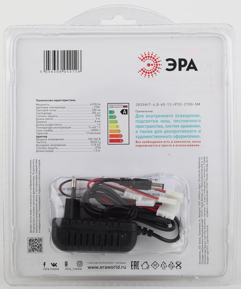Характеристики ЭРА Комплект светодиодной ленты 2835kit-4,8-60-12-IP20-2700-5m: