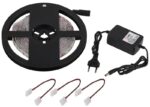 Комплект одноцветной светодиодной ленты 12 В, 14,4 Вт/м, цветовая температура 2700 К, влагозащищенность IP20. Длина ленты 5 м. Тип светодиода 5050, 60 LED/м. В составе комплекта: LED лента на двустороннем скотче, источник питания, коннекторы. Внимание: во избежание выхода из строя не допускается длительная работа ленты в смотанном виде!