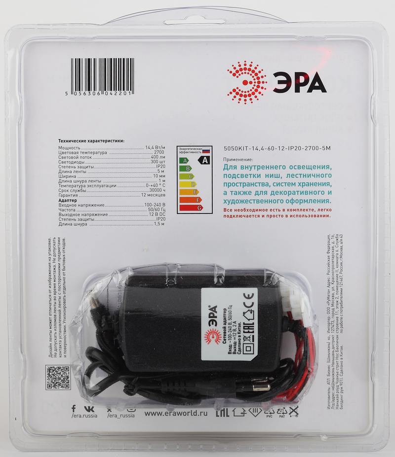 Характеристики ЭРА Комплект светодиодной ленты 5050kit-14,4-60-12-IP20-2700-5m: