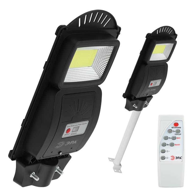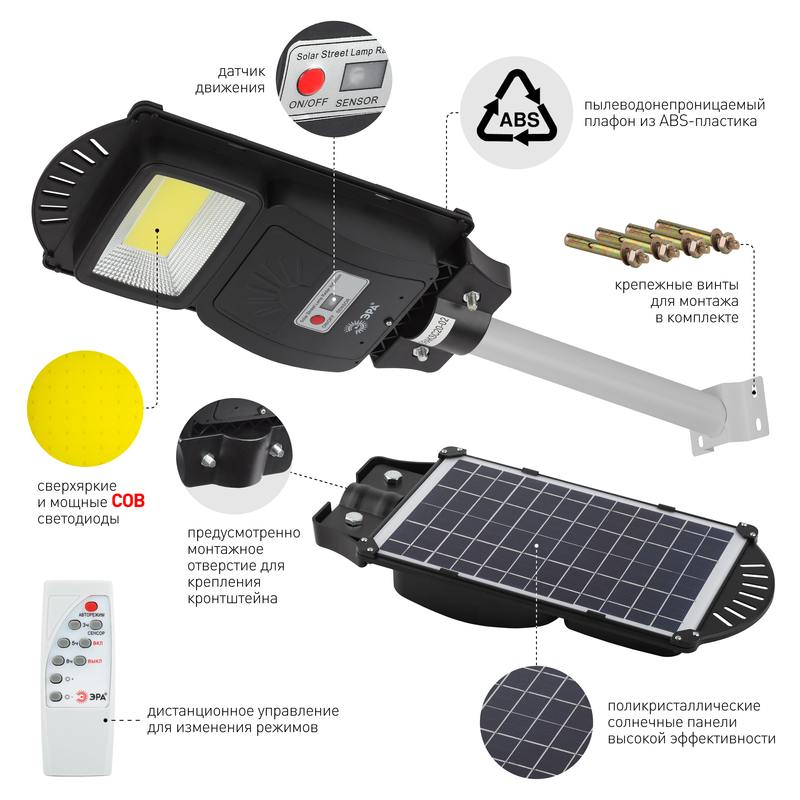 Характеристики ЭРА Консольный светильник на солн. бат.,COB,с кронштейном,20W, с датч.движ., ПДУ, 450lm, 5000К, IP65: