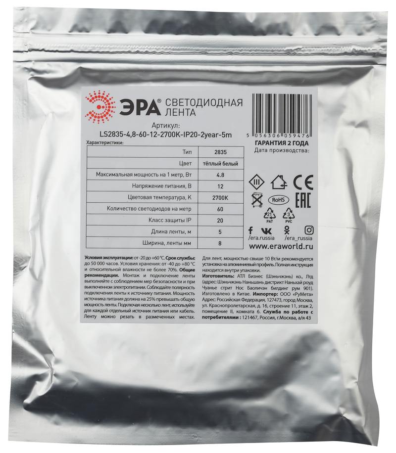 Характеристики ЭРА Лента светодиодная LS2835-4,8-60-12-2700K-IP20-2year-5m: