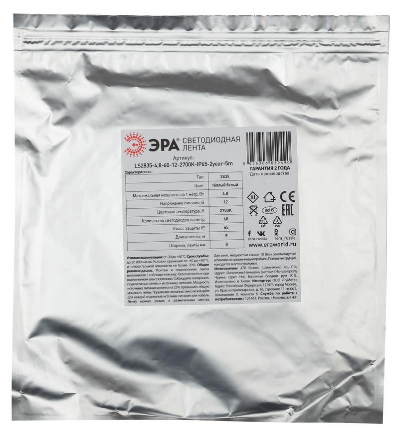 Характеристики ЭРА Лента светодиодная LS2835-4,8-60-12-2700K-IP65-2year-5m: