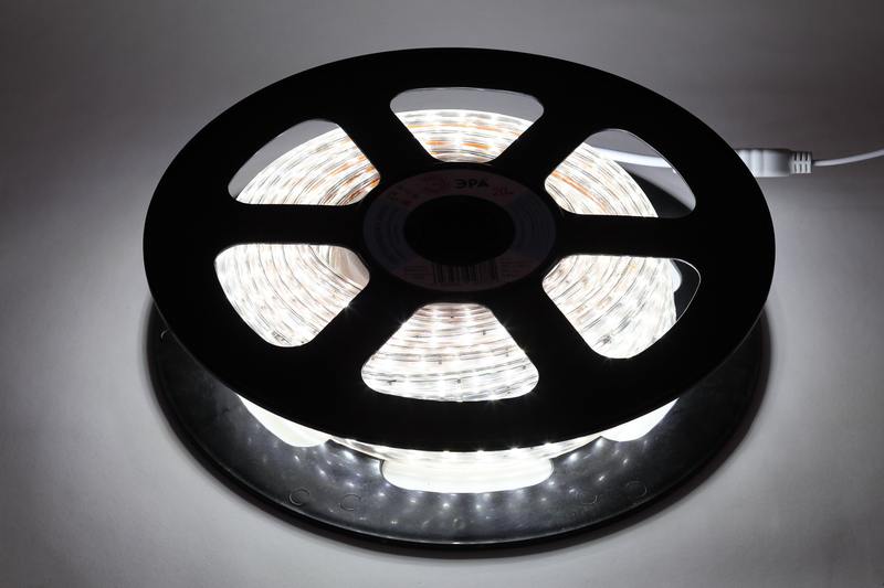 Светодиодная лента 220В, одноцветная, влагозащищённая. Рекомендуется для уличной подсветки. Для надежного крепления в условиях перепада температуры и влажности применяются крепежные силиконовые скобы ЭРА. Торцы ленты необходимо закрывать заглушками. Внимание: во избежание выхода из строя не допускается длительная работа ленты в смотанном виде!