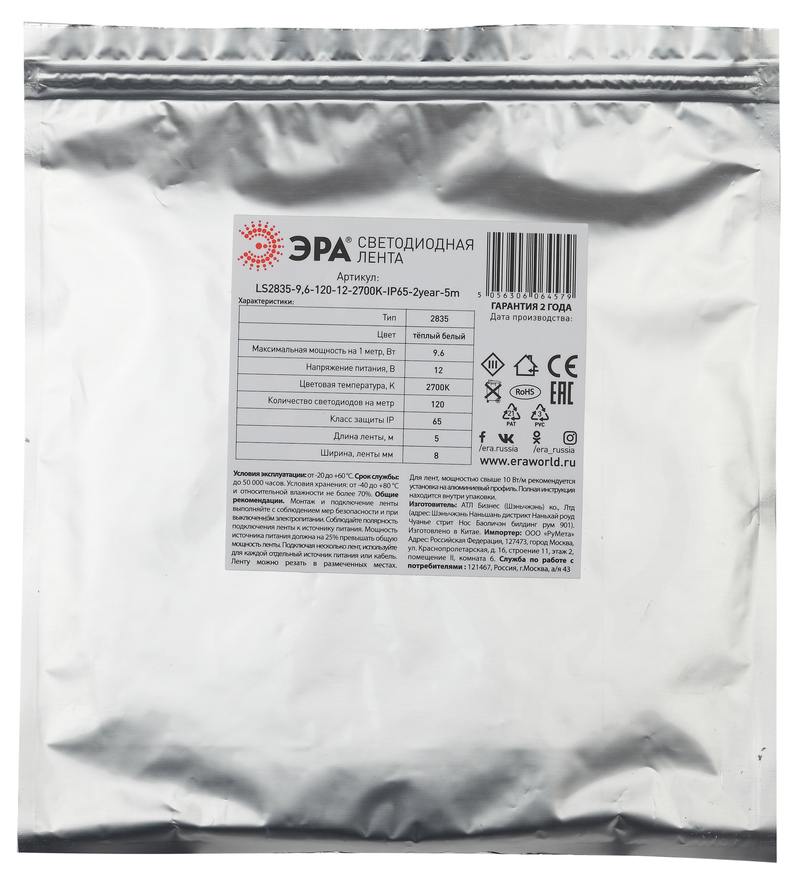Характеристики ЭРА Лента светодиодная LS2835-9,6-120-12-6500K-IP65-2year-5m: