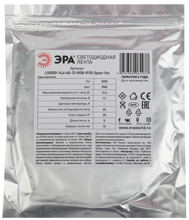 Характеристики ЭРА Лента светодиодная LS5050-14,4-60-12-RGB-IP20-2year-5m:
