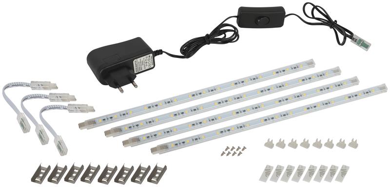 Модульная система, состоящая из 4-х светодиодных модулей. Мощность каждого модуля 2,5Вт. Цветовая температура 4000K. Комплектация: светильник, набор крепежных элементов, ссоед. кабель 3шт., источник питания 15Вт. Включение и выключение производится с помощью выключателя на проводе.