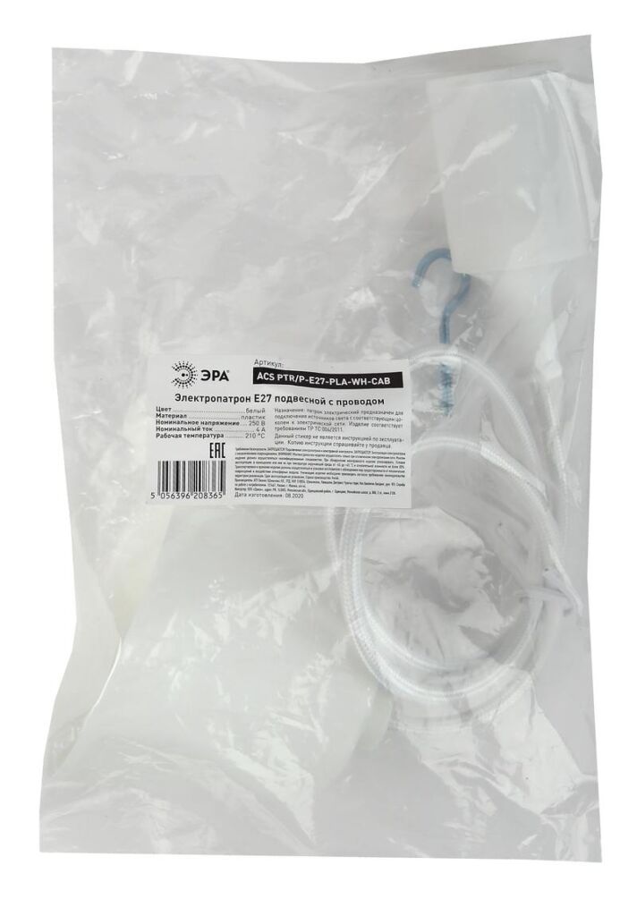 Характеристики ЭРА Патрон пластиковый Е27 с подвесом, белый: