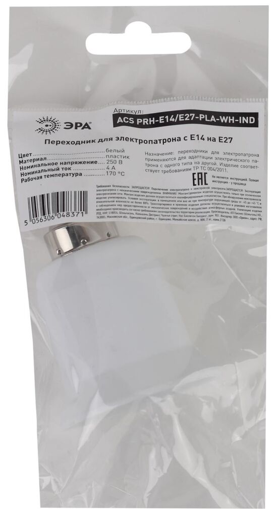 Характеристики ЭРА Переходник E14-E27, пластик, белый:
