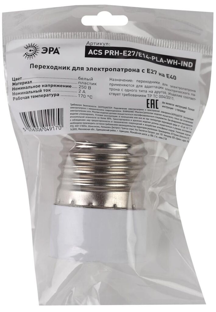 Характеристики ЭРА Переходник E27-E14, пластик, белый: