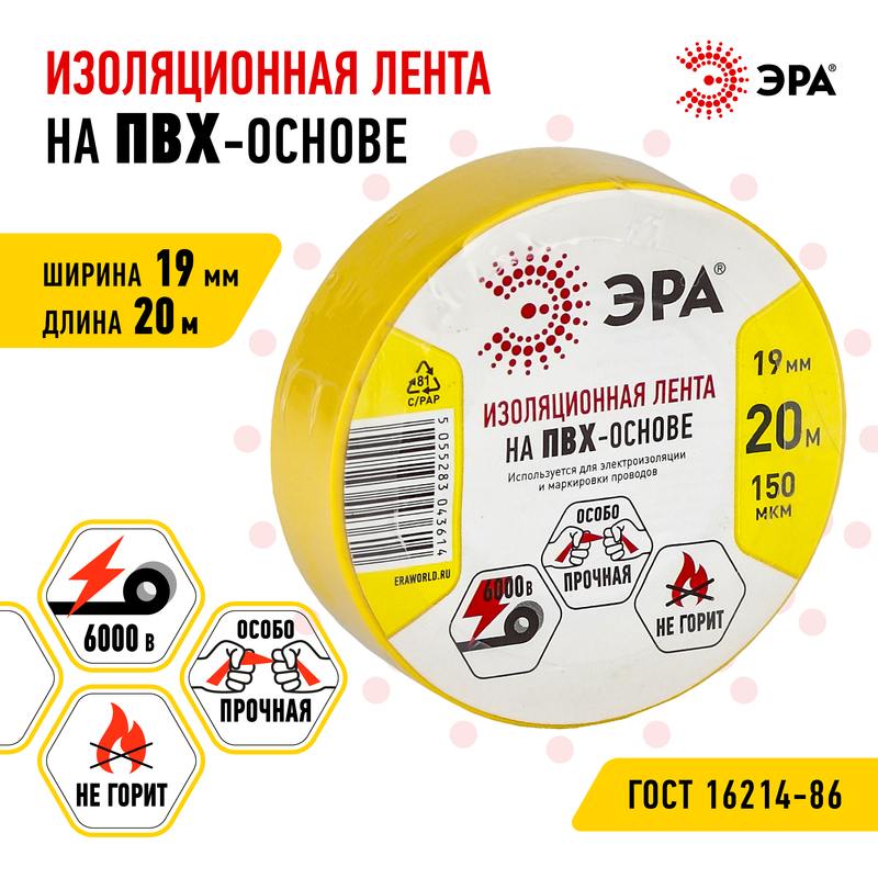 Характеристики ЭРА ПВХ-изолента 19мм*20м желтая:
