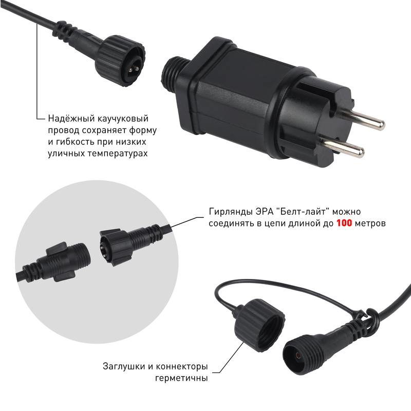 Характеристики ERABL-MK52 ЭРА Гирлянда ЭРА Белт Лайт набор 5 м, 10 RGB LED ,дин.реж, с трансформ.каучук,24В,IP44: