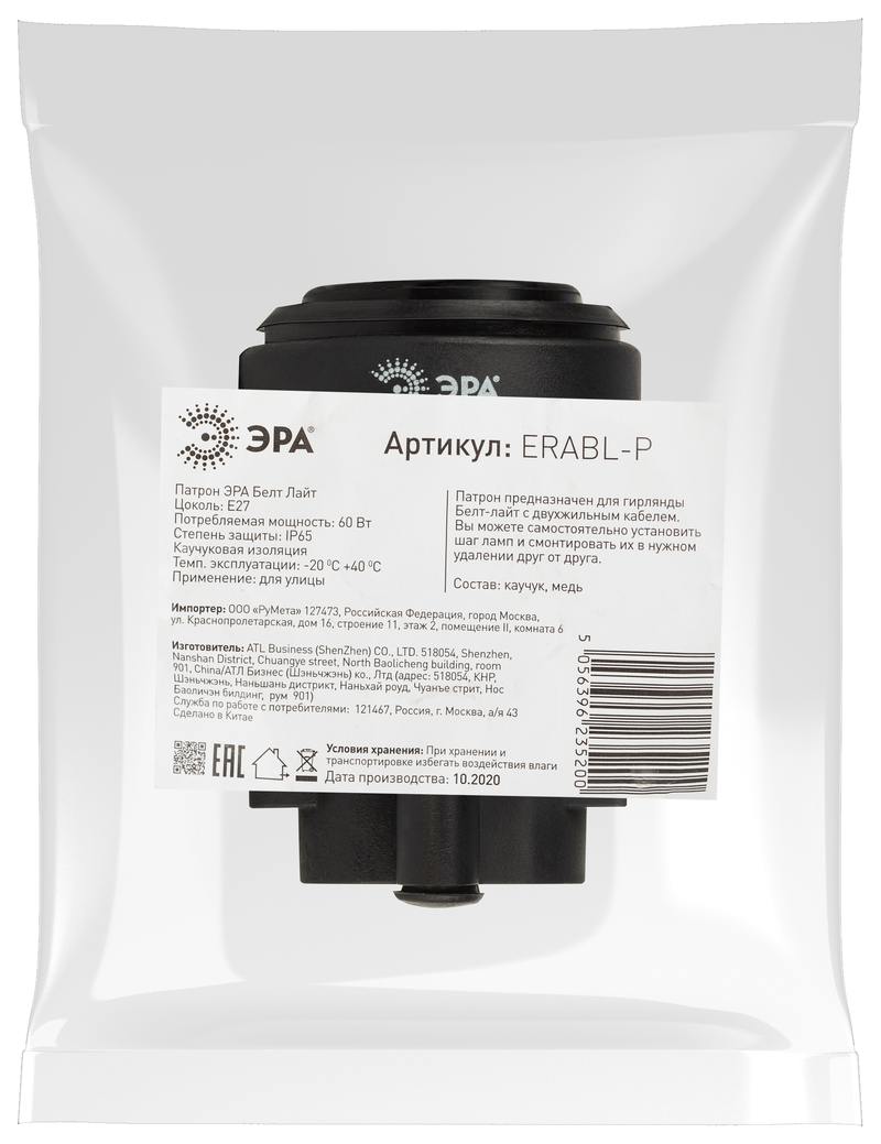 Характеристики ERABL-P ЭРА Патрон для Белт-лайт, E27, IP65, черный: