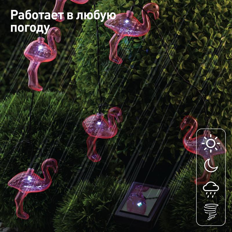 Уличная гирлянда ERADG012-07 "Фламинго" станет необычным украшением вашей дачной территории. Удобная конструкция и простая сборка позволят Вам расположить подсветку для сада среди растений, необычно подсветить аллею, вход в дом, фасад здания или окно. Гирлянда состоит из 10 пластиковых фигурок высотой 10 см. Гирлянда садовая уличная функционирует на солнечной батарее. Данный способ получения энергии является наиболее экологичным и энергоемким. Питание происходит во включенном режиме. С наступлением темноты фламинго загораются. Фигурки заливаются спокойным розовым светом и освещают территорию или объект вокруг себя, создавая романтическую атмосферу.