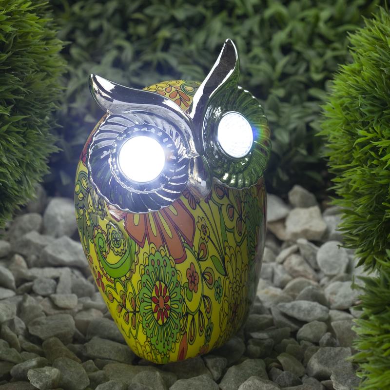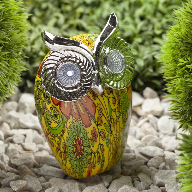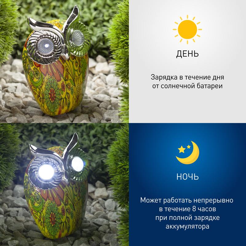 Садово-парковый светильник ERAFYS01-01 "Филин" станет чудесным украшением на вашей загородной территории. Небольшие габариты позволят Вам расположить светильник в палисаднике, украсить прудик, необычно подсветить цветы или вход в дом. Фигурка из полистоуна высотой 16 см с легкостью устанавливается в землю. LED светильник функционирует на солнечной батарее. Такой вид получения энергии является самым экологичным, энергоемким и бесшумным. Питание происходит во включенном режиме, в светлое время суток. С наступлением темноты филин "просыпается". Его большие глаза начинают сиять ярким белым светом, создавая таинственную атмосферу на участке. Пестрый желтый рисунок в виде цветов на корпусе будет прекрасно гармонировать с окружающей филина растительностью. Уличный светильник рассчитан на 8 часов непрерывной работы. Высокая степень пыле и влагозащиты позволяет оставлять устройство на месте даже в дождливую погоду. Обращаем Ваше внимание, что перед использованием фигурки её необходимо включить и зарядить. Светильник заряжается в течение всего светового дня. Декоративный светильник "Филин" на солнечной батарее от компании ЭРА лучший вариант для украшения Вашей территории!