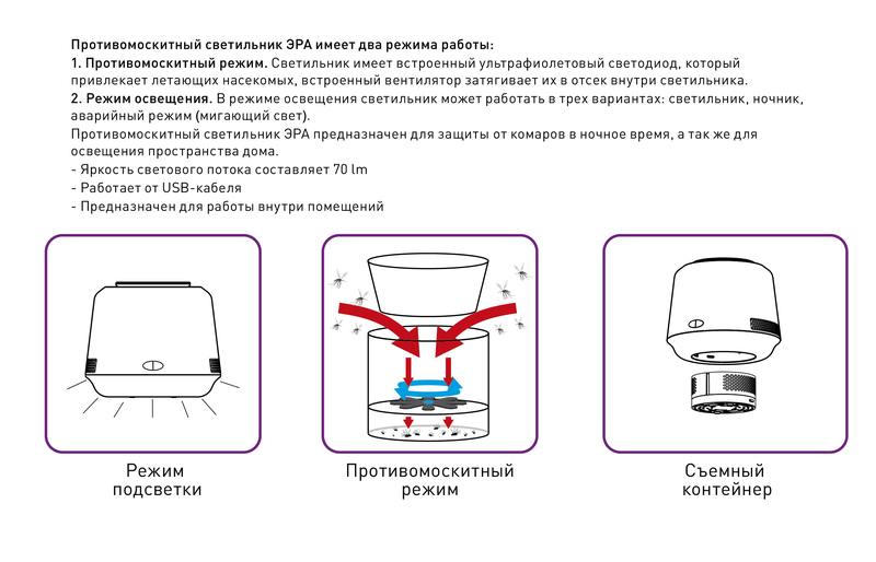 Антимоскитная лампа ЭРА ERAMF-07 незаменима во время летнего отдыха на даче. Она имеет стильный футуристический дизайн, компактна и особенно эффективна в деле защиты от насекомых. Лампа привлекает комаров ультрафиолетовым излучением. Насекомые затягиваются внутрь специальным вентилятором и остаются в отсеке, который легко очищать. Лампа-ловушка для насекомых также работает в режиме освещения. Можно выбрать один из трех вариантов: приглушенный ночник, яркий светильник, аварийный маяк. Яркость светового потока составляет 70 ml. Аксессуар легко взять с собой благодаря компактному размеру. Лампа от комаров подходит для использования внутри помещения, работает от USB-провода. Светильник обладает доказанной эффективностью в борьбе против насекомых, что позволит провести летнее время беззаботно.
