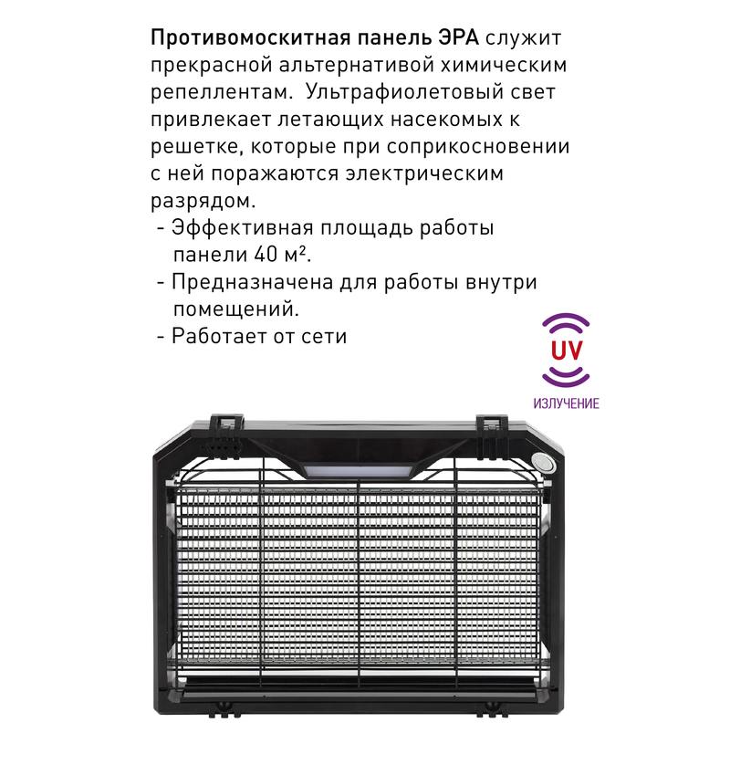 Противомоскитная панель ЭРА ERAMF-09 идеальный помощник в борьбе с назойливыми насекомыми. Лампа от комаров специально разработана для применения в закрытых помещениях. Площадь ее воздействия достигает 40 м², поэтому одной панели вполне хватит, чтобы обеспечить спокойный сон в дачном домике. Антимоскитная лампа уничтожает насекомых путем привлечения их ультрафиолетовым излучением с дальнейшим воздействием легким напряжением. Лампа от комаров работает от сети, излучает приглушенный свет, создавая неповторимую атмосферу домашнего уюта. Противомоскитная панель подойдет для дачного домика или закрытой веранды, ее удобно перемещать, она компактна и эффективна.