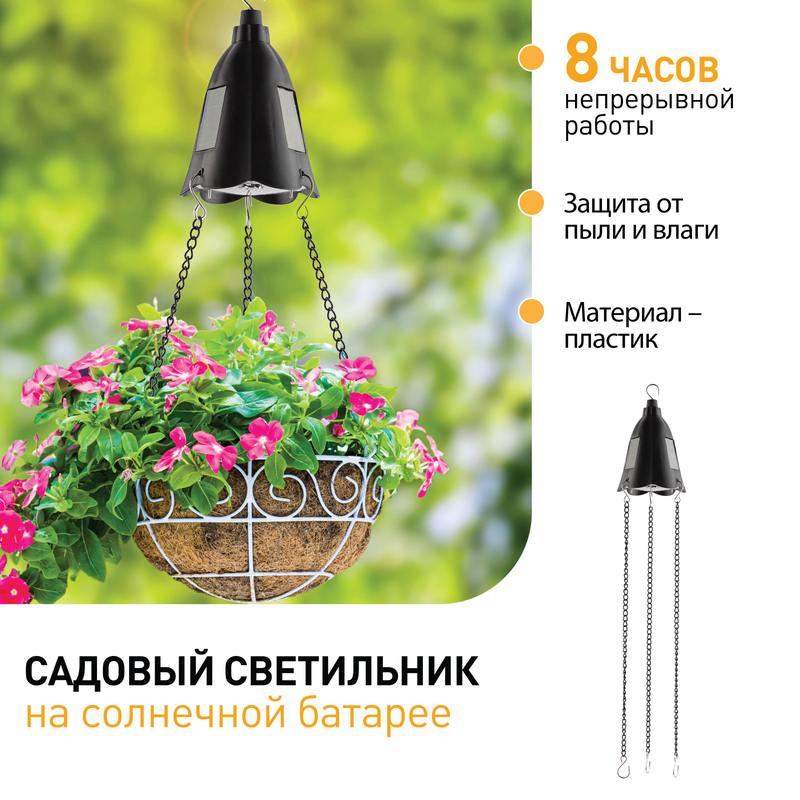 ЭРА ERASF024-30 (арт. Б0044237) — светодиодный садовый светильник с металлическими подвесами для размещения и подвески кашпо. Цветы будут красиво освещены даже в тёмное время суток. Идеальное решение для оформления беседок и веранд. Светильнику под кашпо не нужно подключение к электросети — он работает от встроенных в корпус солнечных панелей. Лёгкая высокопрочная конструкция обеспечивает долговечность и практичность данного садового светильника. Общая высота светильника с подвесами — 16 см. 3 светодиодных лампочки автоматически включаются вечером. Светодиодные батареи накапливают энергию солнца даже в пасмурную погоду.