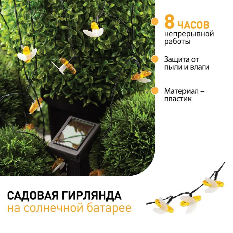 Уличная светодиодная гирлянда ERASG024-03 "Пчелки" станет ярким акцентом на Вашей дачной территории. Удобная конструкция и простая установка позволят Вам расположить гирлянду среди клумб, цветов и кустарников, красочно подсветить аллею, фасад здания или окно. Общая длина 5,8 м. Подсветка работает от солнечной батареи. Такой способ получения энергии является наиболее экологичным и энергоемким. Питание происходит во включенном режиме "ON". С наступлением темноты маленькие пчелки загораются. Их животики заливаются желтым светом, создавая веселую атмосферу. Подсветка улицы может длиться непрерывно в течение 8 часов. Высокая степень пыле и влагозащиты позволяет оставлять светильник на улице даже во время дождя. Обращаем Ваше внимание, что перед использованием фигурки её необходимо включить и зарядить. Светильник заряжается в течение всего светового дня. Создавайте уникальное вместе с гирляндой "Пчелки" на солнечной батарее от производителя ЭРА!