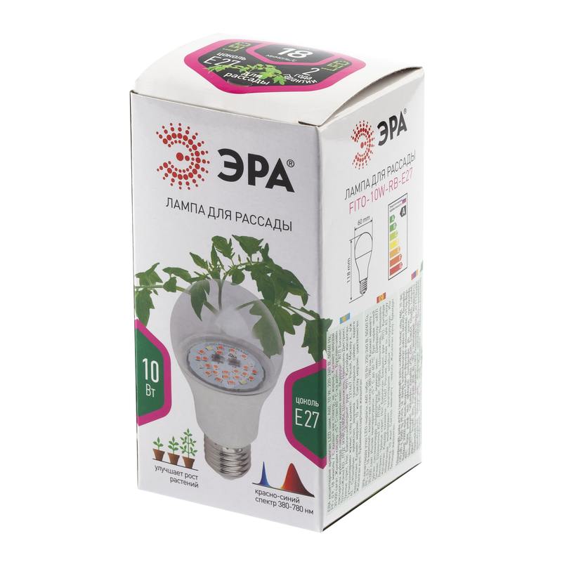 Лампа ЭРА FITO-10W-RB-E27 красно — синего спектра для выращивания рассады, досветки комнатных цветов станет Вашим не заменимым помощником. Данная лампа отлично подходит для зелени, пасленовых. Рекомендуемая высота расположения лампы над листьями от 5 до 25 см. Соотношение синего к красному как 1 к 3 дает возможность растениям марш бросок на набор питательных веществ и рост листьев. Так как масса выращиваемых растений прямо пропорциональна затраченной мощности, необходимо понимать что усиление эффекта от лампы возможно при увеличении светового потока. Во избежание ожога листьев мощность не должна превышать 450 Вт на м2. при высоте подвеса 4 метра. Прозрачный поликарбонатный рассеиватель сохраняет выходящую энергию, в отличие от ламп с молочным рассеивателем. Новый рестайлинг лампы ЭРА FITO-10W-RB-E27-K лампа ЭРА FITO-10W-RB-E27 отличился более хорошей светоотдачей, связанной более хорошей подобранной биновкой светодиодов, более низким током через кристалл, что позволило снизить температуру на светодиоде на 5 градусов и соответственно увеличить их срок жизни. Разгруженным драйвером, что позволило уменьшить температуру на управляющей микросхеме на 10 градусов, что так же увеличит ресурс ее работы. Спектрограмма и суммарная мощность лампы не изменилась.