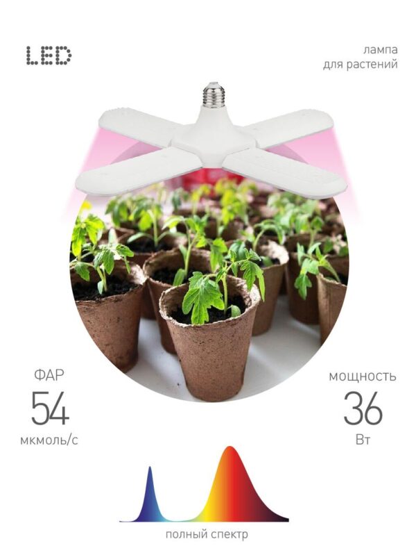 Характеристики Фитолампа для растений светодиодная ЭРА FITO-36W-RB-E27-FOLD 4-х лепестковая красно-синего спектра 36 Вт Е27: