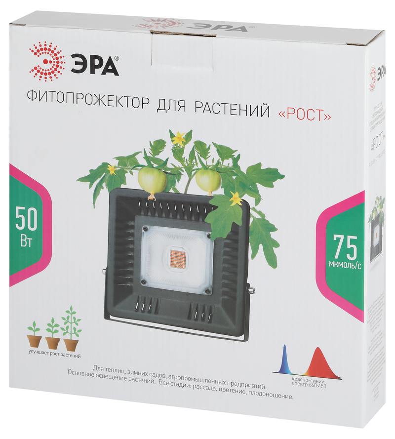 Светодиодный прожектор ЭРА FITO-50W-LED BLUERED предназначен для выращивания растений в теплицах и оранжереях на всех стадиях: рассады, цветения, плодоношения. Главной особенностью фитолампы является красно-синий спектр излучения. Он заботится об увеличении урожая и быстром росте растений. По сравнению с белым светом красно-синий увеличивает эффективность поглощения в несколько раз. Прожектор защищен от пыли и влаги: поливайте рассаду и не думайте о поломке. За счет светодиодов светильник для растений значительно экономит расход электроэнергии. Прожектор можно использовать в широком диапазоне температур: от -30 до +45 градусов; прорезиненный провод выдерживает морозы. Он легко крепится на встроенный кронштейн или специальный подвес, который идет в комплекте. За счет светового потока в 75 мкмоль его можно устанавливать на высоте до 2,5 м над рассадой. Создайте для любимых растений комфортные условия, а себя обеспечьте большим урожаем вместе с фитопрожектором ЭРА!