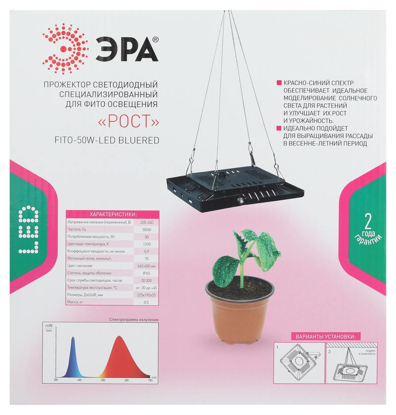 Характеристики Фитопрожектор для растений светодиодный ЭРА FITO-50W-LED-BLUERED для цветения и плодоношения 50Вт красно-синего спектра: