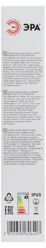 Характеристики Фитопрожектор для растений светодиодный ЭРА FITO-80W-RB-LED-Y красно-синего спектра: