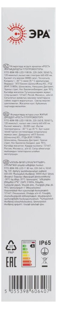 Характеристики Фитопрожектор для растений светодиодный ЭРА FITO-80W-RB-LED-Y красно-синего спектра: