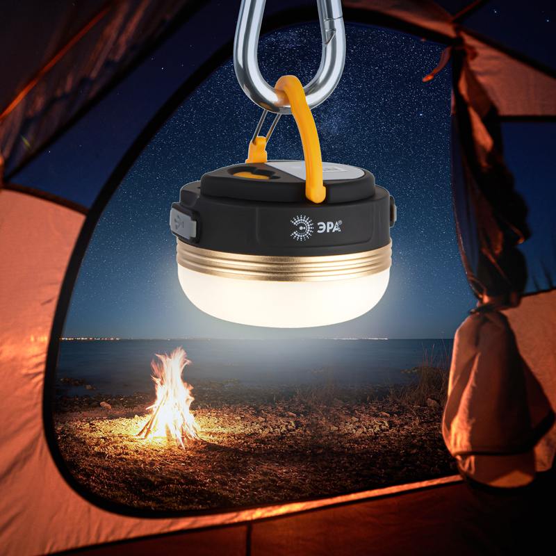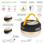 ЭРА KA-501 "Феникс" — компактный кемпинговый фонарь с удобным креплением для подвешивания. Работает от встроенного аккумулятора, USB-кабель для подзарядки в комплекте. Яркий качественный свет создают 5 светодиодов нового поколения. Эргономичный круглый корпус изготовлен из легкого ударопрочного пластика. Одной подзарядки хватает на 6 часов непрерывного свечения. Несмотря на малый размер, отличается хорошим световым потоком — 230 Лм. В зависимости от ситуации выбирайте режимы работы: 1) 100% яркость, 2) 50% яркость; 3) стробирование; 4) SOS. Мощность этого удобного фонарика — 3 Вт. Важное преимущество — фонарь можно использовать как powerbank, подзаряжая от него мобильные устройства. После полной подзарядки непрерывно светит 6 часов. Кемпинговый фонарик ЭРА "Феникс" защищен от влаги и пыли (IP44), он обеспечит вас надежным освещением в любую погоду!