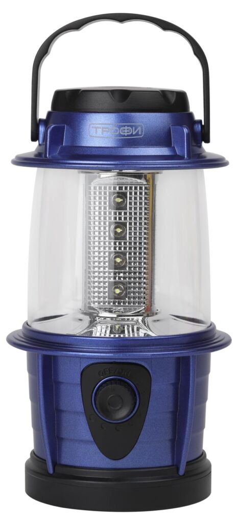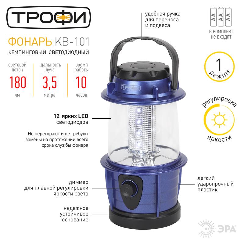 ТРОФИ КВ-101 — кемпинговый светодиодный фонарь в стильном корпусе оттенка синий металлик. Работает от 3 пальчиковых батареек (3 х АА). Оснащён диммером для плавной регулировки яркости света. Имеет удобную ручку для переноса и подвеса. 12 ярких светодиодов нового поколения равномерно распределены по всем сторонам светильника, что позволяет создать качественное объёмное освещение. Прекрасный вариант для походов, отдыха на природе, для дачи, бытовых, строительных и ремонтных работ. От одного комплекта алкалиновых элементов питания непрерывно светит 10 часов. Яркая фирменная упаковка и эффектное оформление фонаря делают ТРОФИ КВ-101 универсальным подарком к любому празднику для любого человека.