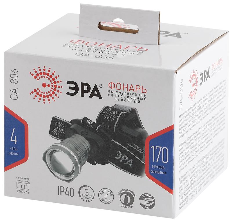 Характеристики Фонарь налобный светодиодный ЭРА GA-806 аккумуляторный мощный 3 режима черный c регулируемая фокусировка луча: