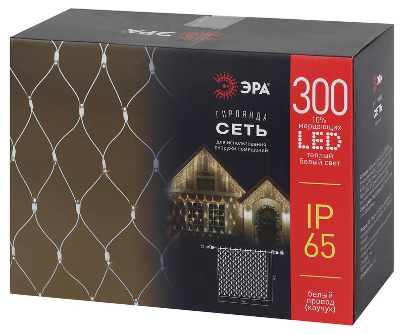 Характеристики Гирлянда ЭРА ERAPS-SKW1 светодиодная новогодняя сеть 2×3 м тёплый белый свет 300 LED белый каучук: