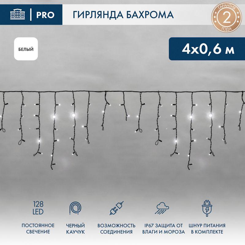 Характеристики Гирлянда светодиодная «Айсикл» (бахрома) 4х0.6м 128LED бел. 10Вт 230В IP67 провод каучук черн. Neon-Night 255-225: