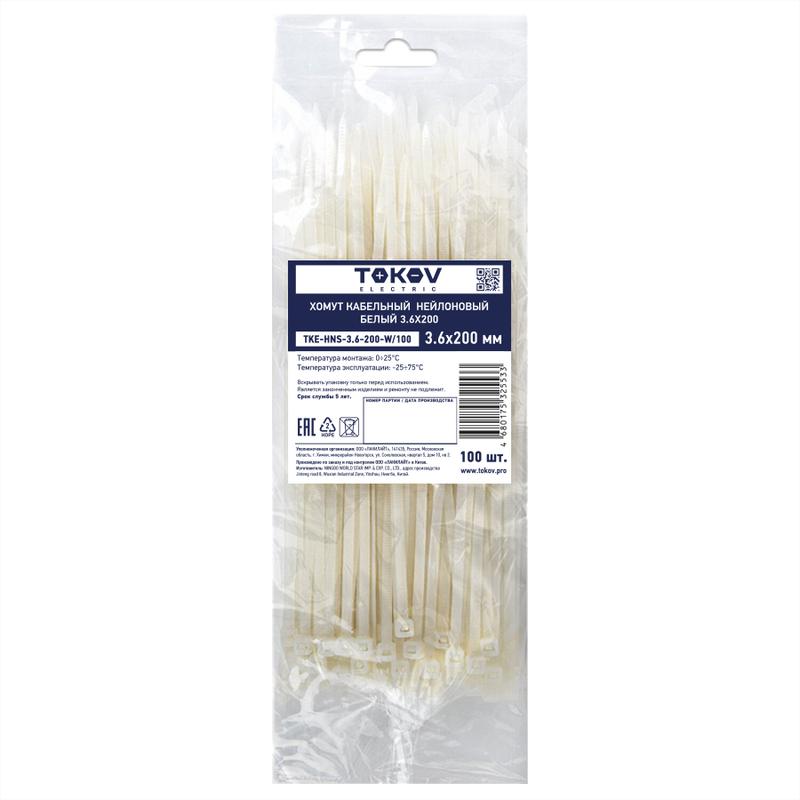 Характеристики Хомут кабельный нейлоновый бел. 3.6х200 (уп.100шт) TOKOV ELECTRIC TKE-HNS-3.6-200-W/100: