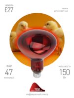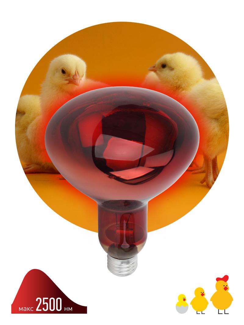 | Преимущества | Инфракрасная зеркальная лампа с красной колбой. Активно используется в животноводстве, птицеводстве и растениеводстве. Максимальная тепловая мощность без яркого света. Идеальна для стабилизации теплового баланса новорождённых и молодых животных. 100 % энергии переходит в тепловую. Работа лампы не зависит от скачков сети, микроимпульсов. Не требуются стабилизаторы напряжения – лампа работает даже при пониженном напряжении. Мгновенно включается и нагревается. Минимум пульсаций освещения. Компактные размеры (удобно при транспортировки и использовании). Используется только с керамическими цоколями (не с пластиковыми!). |