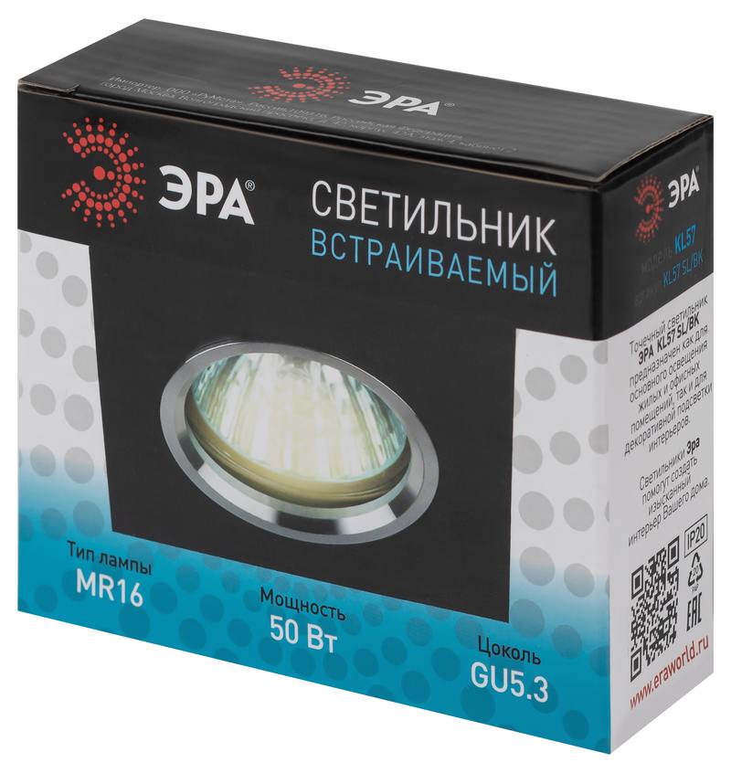 Характеристики KL57 SL/BK Светильник ЭРА литой алюминевый MR16,12V/220V, 50W серебро/черный: