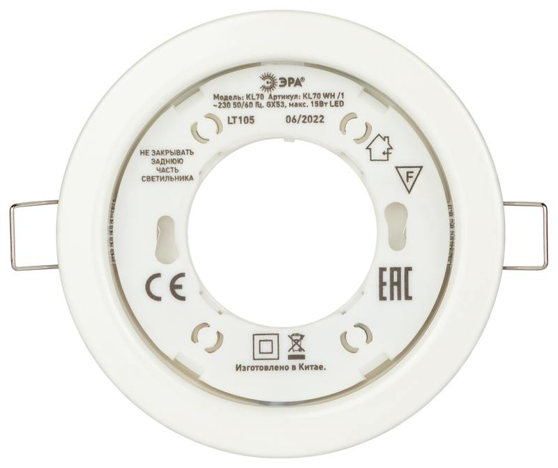 Характеристики KL70 WH /1 Светильник ЭРА под лампу Gx53 тонкий , 220V, 13W, белый: