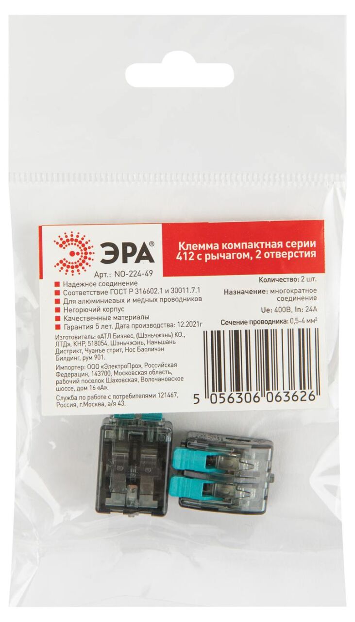 Характеристики Клемма ЭРА компактная серия 412 с рычагом 2 отверстия 0.5-4 мм2 упаковка 2 шт.: