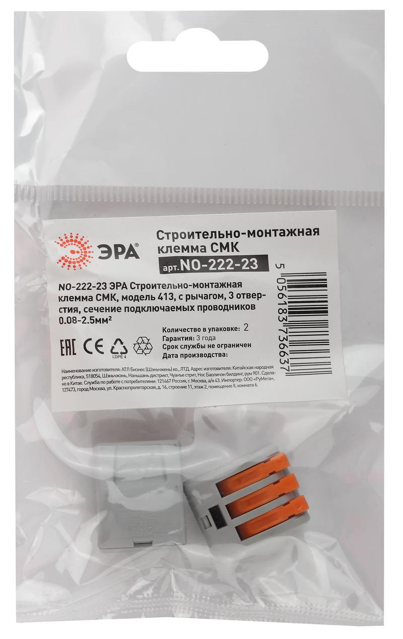 Характеристики Клемма ЭРА серия 413 с рычагом 3 отверстия 0.08-2.5мм2 упаковка 2 шт.: