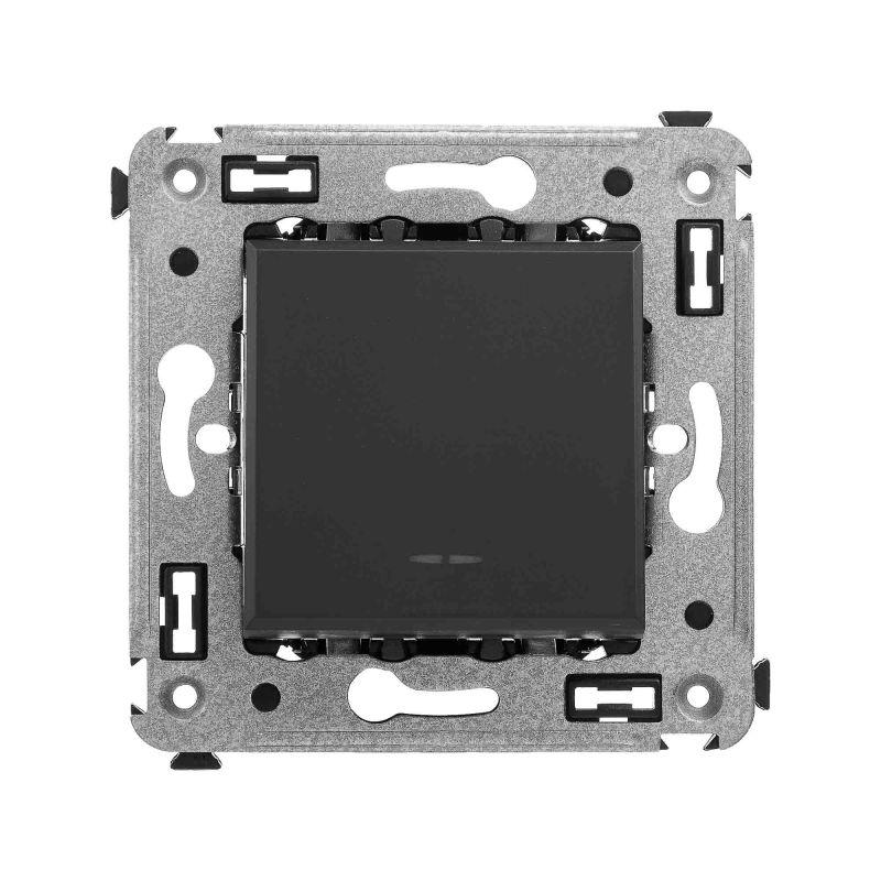 Кнопка одноклавишная. Назначение: для монтажа в подрозеточные коробки глубиной не менее 45 мм (код 59301). Используется в качестве кратковременного включения источника питания энергией. Характеристики: 2 модуля, диаметр отверстий для ввода кабелей – 3 мм (по 2 отверстия на одну клемму); винтовые зажимы; шаблон для зачистки кабеля – 11 мм; номинальный ток – 10 A; номинальное напряжение – 230 В; фиксация в подрозеточные коробки при помощи каркаса с лапками (код 4400802) и саморезов. Цвет: «Черный матовый».