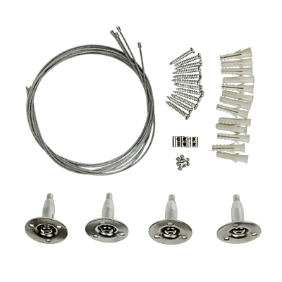 Комплект подвесов LP-КПТ от компанииТМ IN HOMEпредназначен для монтажа светодиодных панелей на горизонтальных и наклонных поверхностях при помощи креплений на тросах. Комплектация включает: трос металлический 1 метр – 4 шт., держатель тросовый потолочный – 4 шт., дюбель пластиковый в комплекте с саморезом – 12 шт., зажим тросовый – 4 шт., заглушка с резьбой – 8 шт., уголок крепежный – 4 шт