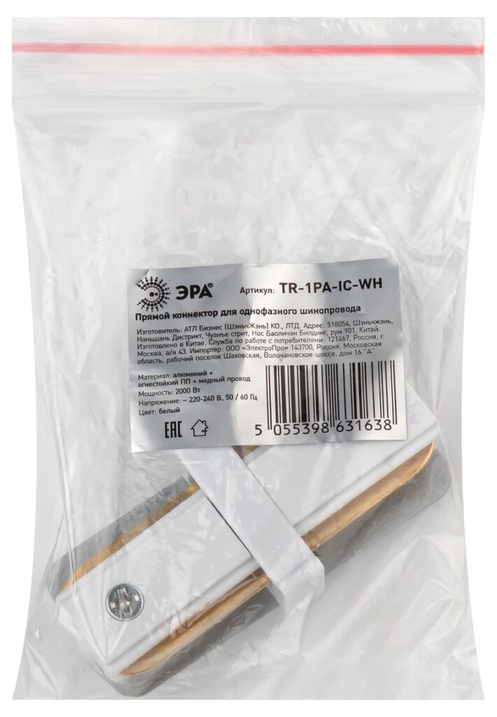 Характеристики Коннектор ЭРА TR-1PA-IC-WH прямой для однофазного шинопровода белый: