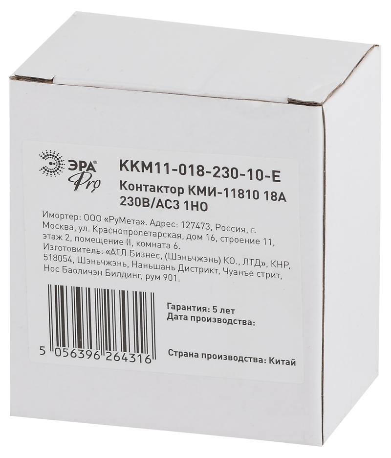 Характеристики Контактор ЭРА PRO KKM11-018-230-10-E КМИ-11810 18А 230В/АС3 1НО: