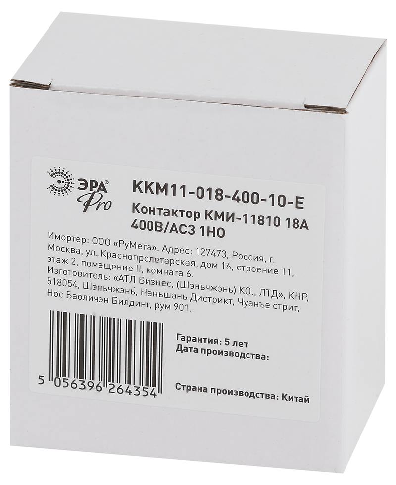 Характеристики Контактор ЭРА PRO KKM11-018-400-10-E КМИ-11810 18А 400В/АС3 1НО: